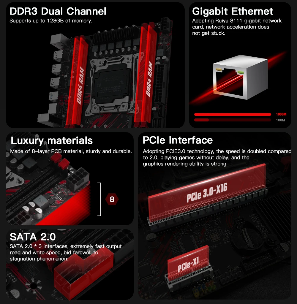 Memory technology: Desktop DDR3, Server DDR3 ECC, DDR3 RECC, support dual channel. Maximum capacity 128GB. Desktop memory and server memory cannot be used at the same time. (Please use international brands such as Samsung, Kingston, Micron, Hynix, etc. Other brands may not be compatible)